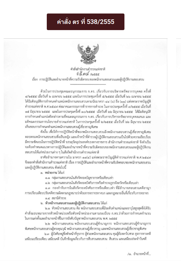 คำสั่งสำนักงานตำรวจแห่งชาติที่ 538/2555 เรื่องการปฏิบัติหน้าหน้าที่ความรับผิดชอบของพนักงานสอบสวนและผู้ปฏิบัติงานสอบสวน